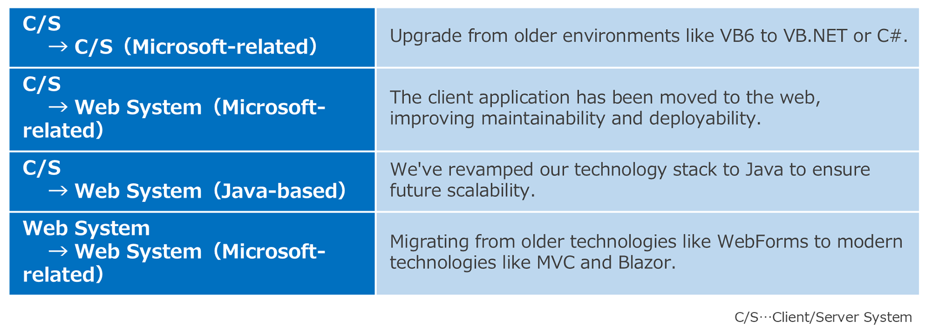 Microsoft (MS) systems that support corporate operations have long been built on a foundation of technologies such as Visual Basic 6.0 (VB6) and . However, these technologies have already entered a phase of end-of-life support and reduced functionality, and are becoming a major risk factor for future operation and maintenance.