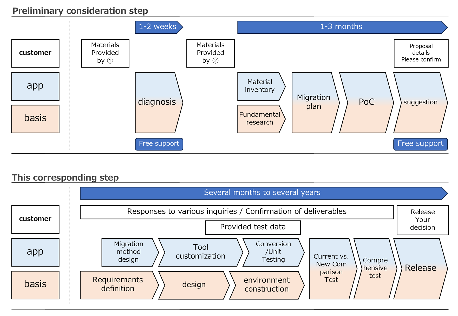 It is executed in two major processes. In the “Preliminary Study Step,” an overall migration plan is established while confirming feasibility, and proposals are made for the “Main Response Step. In the “main response step,” we convert all materials to be migrated, build the infrastructure, and conduct various tests.