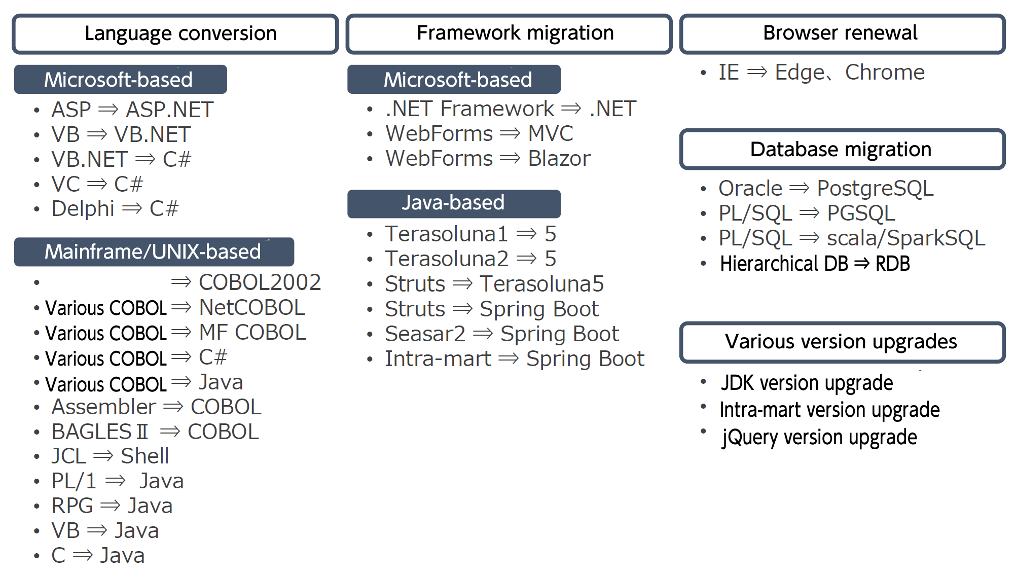 Specifically, we can migrate or upgrade the following programming languages, frameworks, etc.