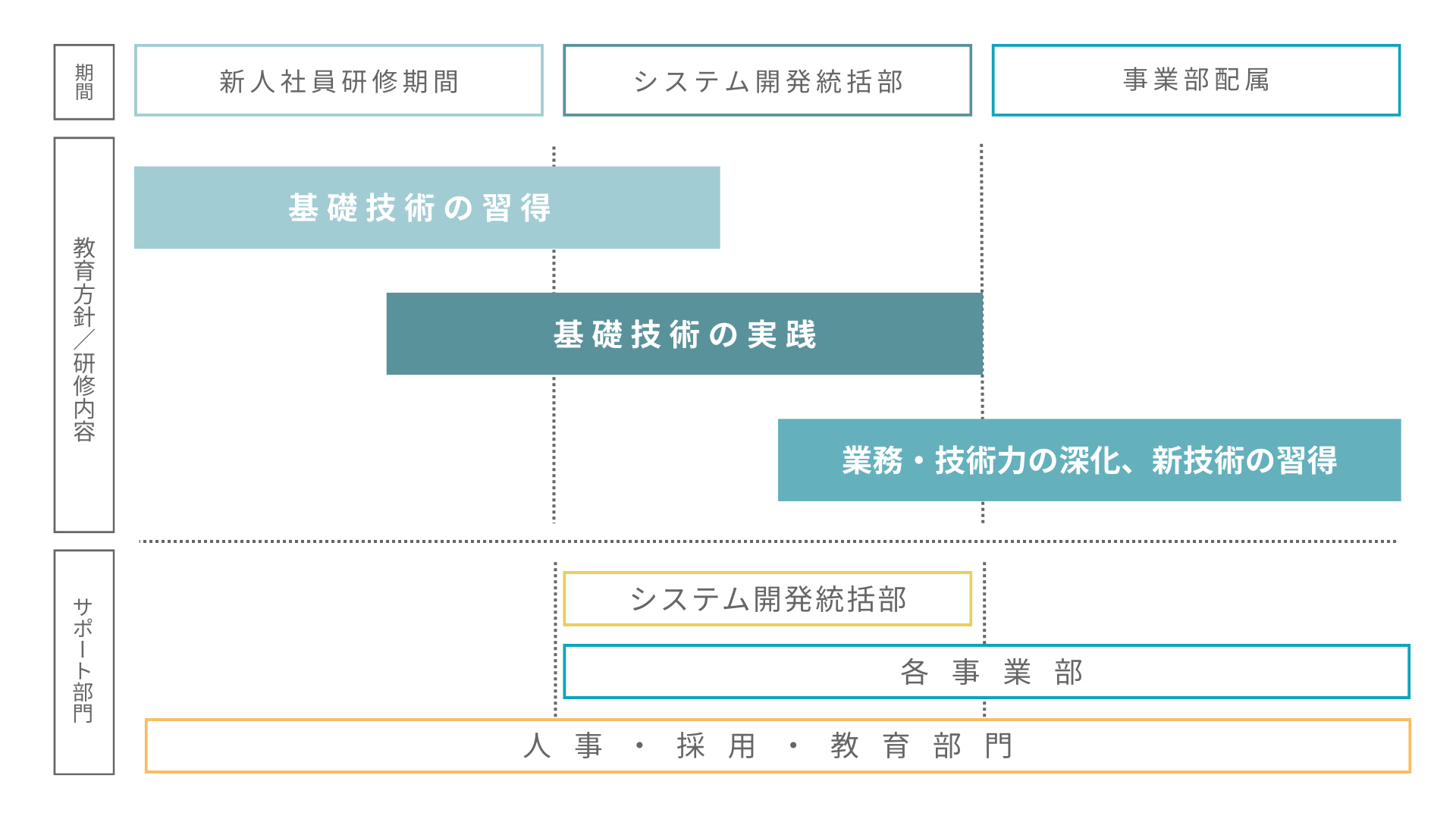 3か月の研修を終えた後、2~3年間は「システム開発統括部」に所属し、各事業分野のプロジェクトに参画します。プロジェクトでは、 研修で身につけた知識を実践しながら、上司や先輩社員たちが技術や業務知識の面から成長をサポートし、システム開発統括部では、社員が主体となって組織運営をし、主体性・自律性を育んでいきます。また、職場環境などの相談事に対して親身になってサポートする体制が整っており、縦軸と横軸のダブルで成長をサポート。基礎知識や技術を磨くだけでなく、教え合い・学び合う文化が根付いているため、プロジェクトで得た知見を共有し、高め合える環境です。