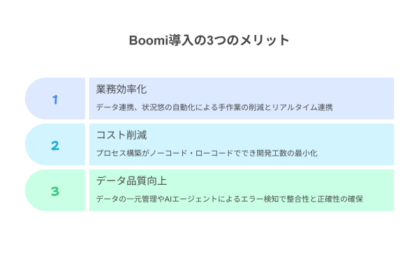 Boomiの導入で、これまで手作業で行っていたデータ転記やシステム間の情報共有が自動化され、業務のスピードと正確性が大幅に向上します。
