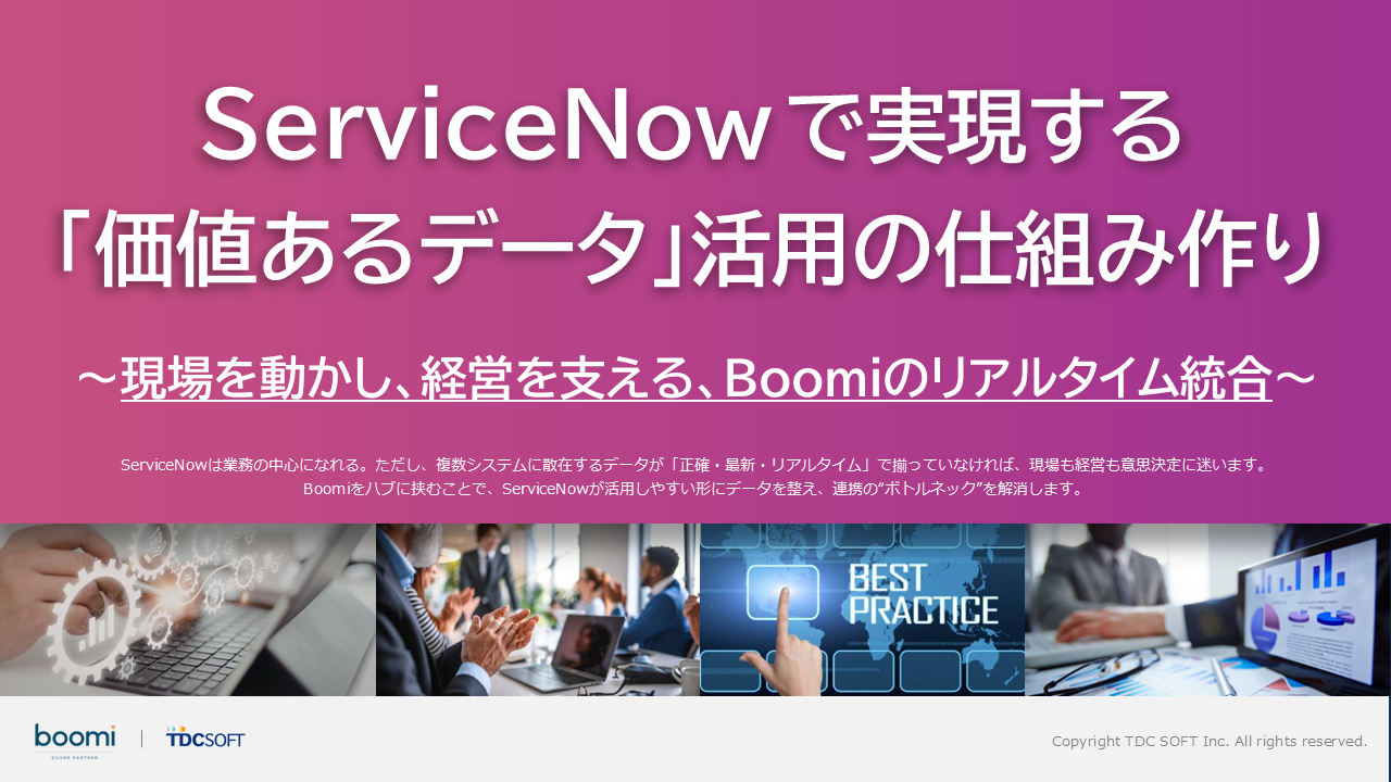 複数システムに分散したデータをリアルタイムに統合し、重複や更新遅延のない“使えるデータ”へ整備する方法を解説。ServiceNow活用を阻むボトルネックをBoomiで解消し、現場と経営の意思決定を支える仕組みづくりのポイントをまとめたホワイトペーパーです。