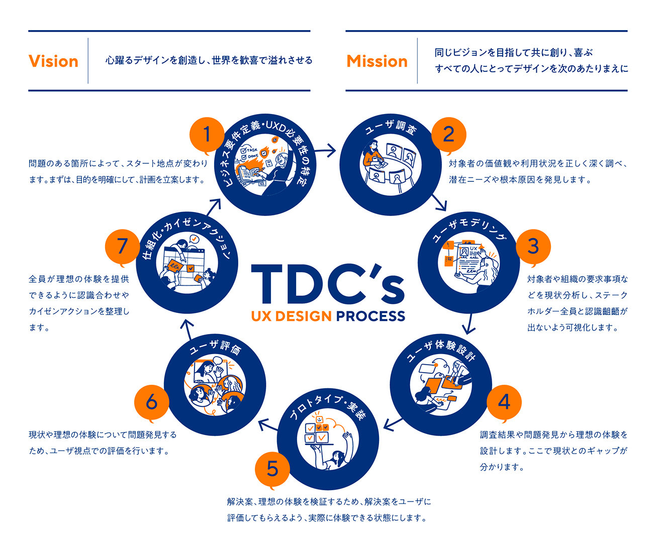 では、具体的なサービスの中身とは何か。大まかに見ると、従来のシステム開発「企画から設計、開発、保守まで」とそう変わらない。UXデザインのプロセスで決定的に違うのがユーザー把握のための「調査」と、調査結果に基づく仮説の効果を検証する「評価」のフェーズが最初と最後に設けられている点だ。さらにTDCソフトでは、最後に独自の「仕組化・カイゼンアクション」を設けており、持続可能なUXデザインを追究している。