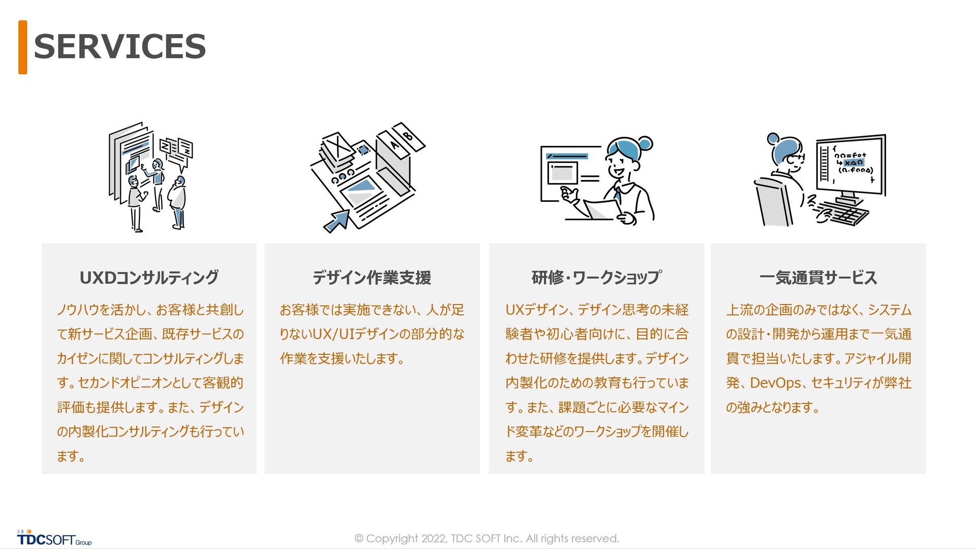 これまで培ってきたUXデザインに関する豊富な知見を持つTDCソフト。酒井氏は、同社のUXデザインサービスの強みとして「企画立案からシステム開発、さらにユーザー評価・調査によるカイゼンサイクルの仕組化までを一気通貫で後押し、その中で多様なUXデザイン課題の解決を支援します」と胸を張る。