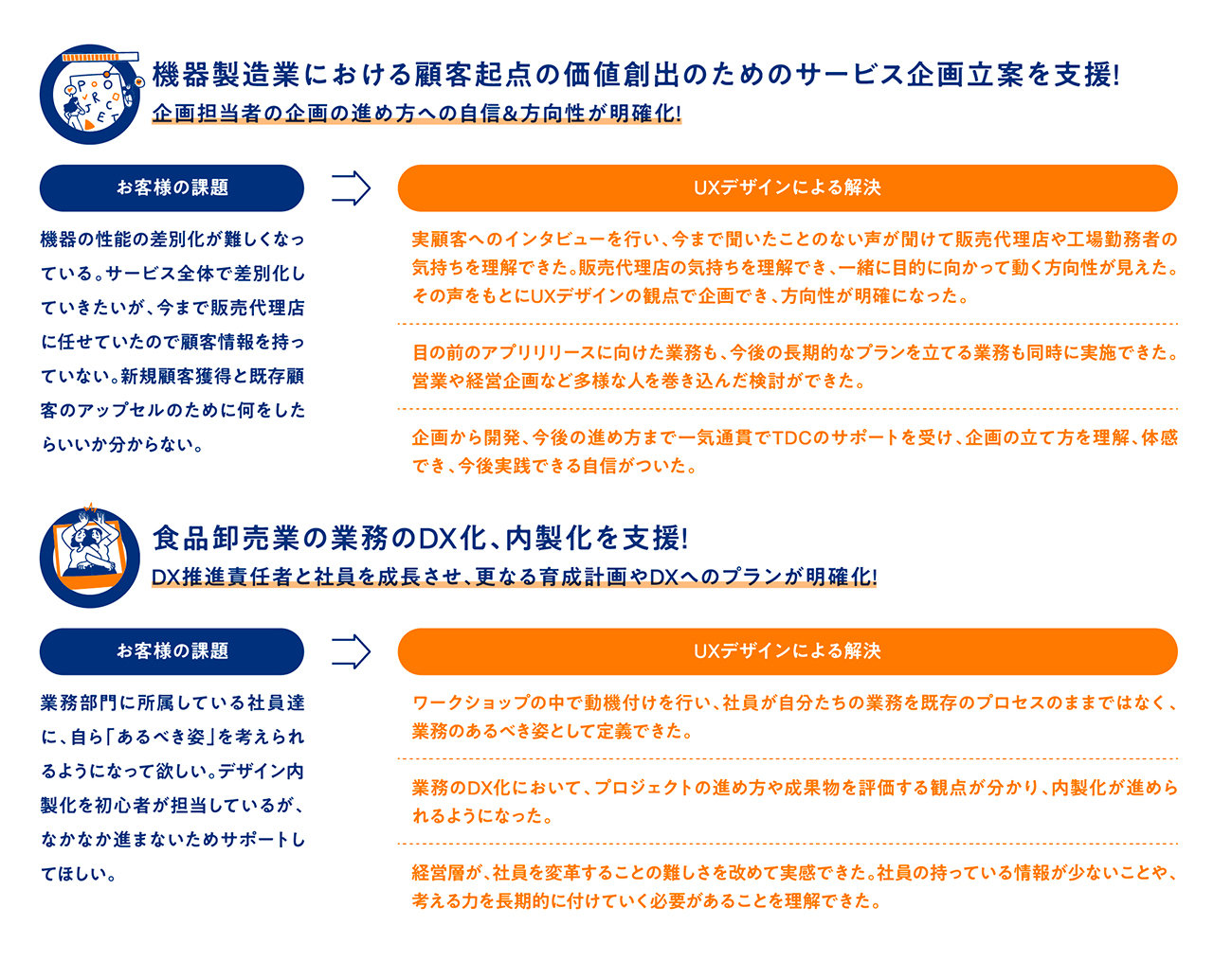 そうした中、創業60年を迎えたTDCソフトは、企業のUXデザイン支援に先進的に取り組んできた会社だ。2019年から「UXデザイン」サービスを開始。以来、製造業や流通業、情報通信、金融・保険業、教育機関など、幅広い業界で数多くの実績を積み上げてきた。