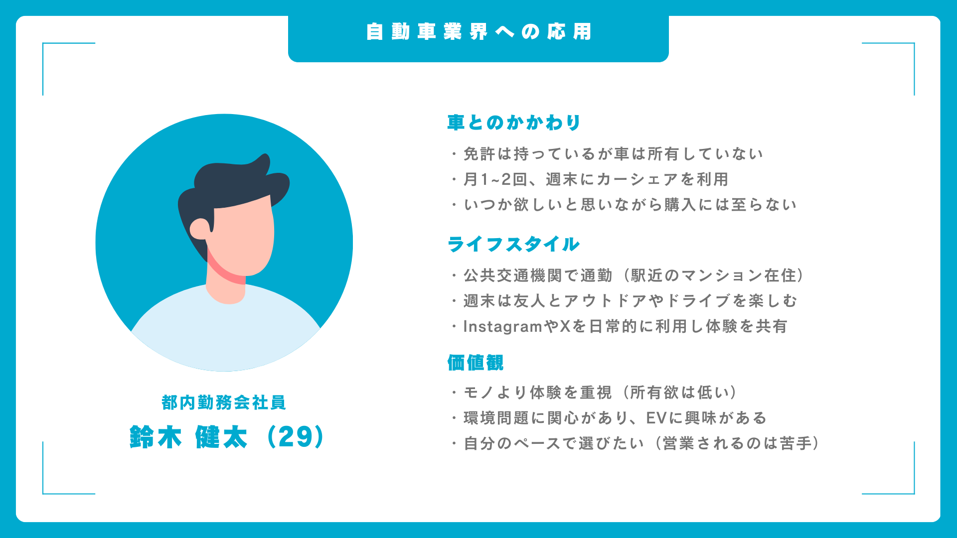 一例と​して、​自動車の​所有を​促すために、​ファンマーケティングと​いう​視点から​考えてみました。​