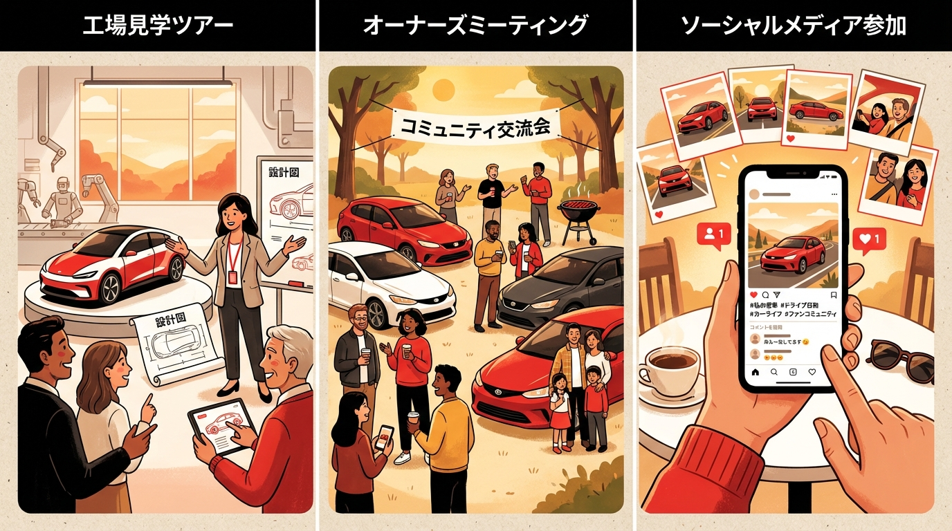 車購入前後問わず、同メーカー顧客の​顧客同士で、ハッシュタグなどを活用、SNS発信を​促し​共感の​輪を​広げるとともに、​ブランドへの​帰属意識を​高めます。​​優秀投稿の​表彰、​投稿者限定特典の​提供などが​施策と​して​考えられます。