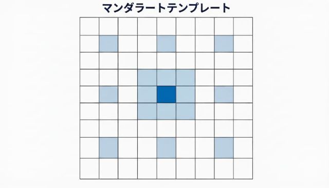 使い方はシンプルです。中央に課題やテーマを書き、周囲の8マスに関連ワードを埋めます。さらにその8つを新たな中心に据えて要素を展開することで、アイデアの結合や深化を促進します。