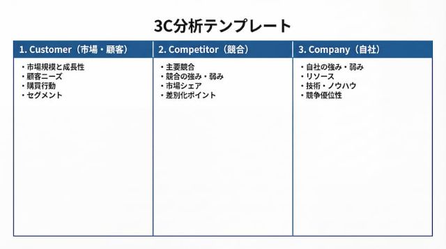 顧客(Customer)、競合(Competitor)、自社(Company)の3視点で環境を分析するのが、3C分析です。ミクロな視点での分析を行う手法で、具体的な事業環境にフォーカスし、自社が成功するための鍵(KSF)を導き出すために活用します。