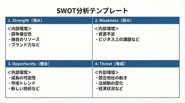 自社の内部環境(強み・弱み)と、外部環境(機会・脅威)を整理し、戦略の方向性を決定するフレームワークです。3C分析の結果を参照しつつ行う手法で、現状を多角的かつ深く分析できます。