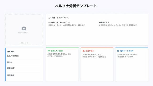 「誰の課題を解決するのか」を明確にするため、典型的なユーザー像をリアルに設定するフレームワークです。顧客分析やアンケートなどで取得したデータをもとに、年齢や職業、価値観、抱えている悩み、行動パターンなどを詳細に描き出します。