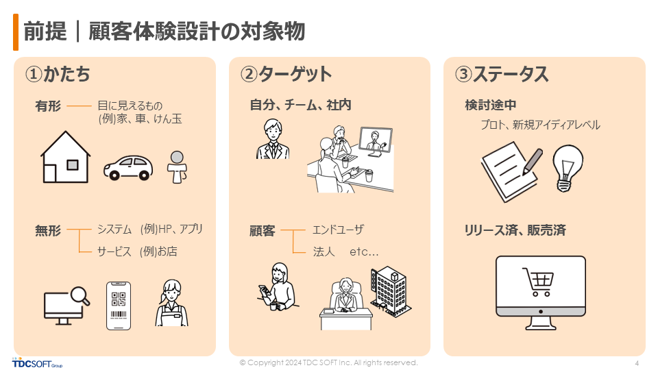 社員、エンドユーザ、顧客など、結論としては「どれも対象」だ。また、何か1つの題材があればよく、リリース状況(未/済)や具体化のレベルは問わない。何かしらの対象物があれば良い。チャネルだけを考えたいマーケター、サービス売ることだけを目標とした営業や、会社全体、全社横断DXの進め方を考える人は対象外となる。