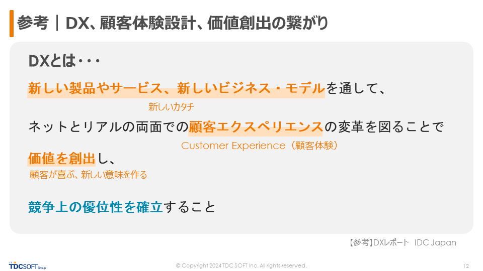 DXとは、新しいものを通して顧客エクスペリエンスの変革を図り、価値を創出し、競争上の優位性を確立すること。つまり、顧客起点で価値創出を行うための事業やビジネスモデル変革であり、顧客体験設計は、顧客起点で価値創出やデザインを行うための手法だ。