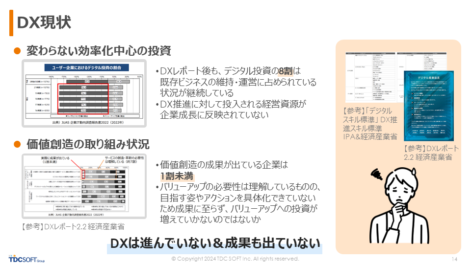 DXの現状を見ると、デジタル投資の8割は業務効率化の部分にあてられており、DX(価値創出)は1割未満と進んでいない状況だ。DXレポートでは、方向性や実施すべきことなどは記載されているが、具体的なイメージが湧き辛いものとなっている。