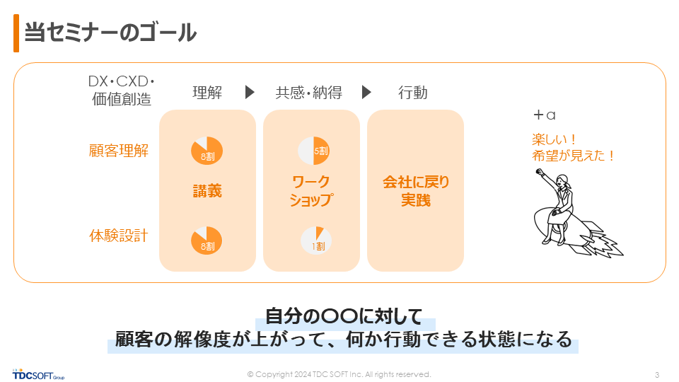 また、DX推進にあたり、3つのつまずくポイントがあり、これらは、外部要因(環境、組織の文化醸成の問題)が解決していても、考慮が必要となる。それぞれのつまずきポイントでは、本日実施する顧客体験設計が有効だ。泥臭い方法での第一歩となるが、顧客の解像度を高め、価値創造の体験には、是非この後のワークに取り組んで頂きたい。