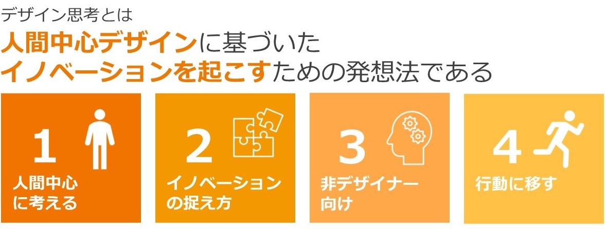 デザイン思考とは、問題解決やイノベーションを生み出すことに焦点を当て、ユーザのニーズや課題を深く理解し、問題解決を目指すアプローチのことである。