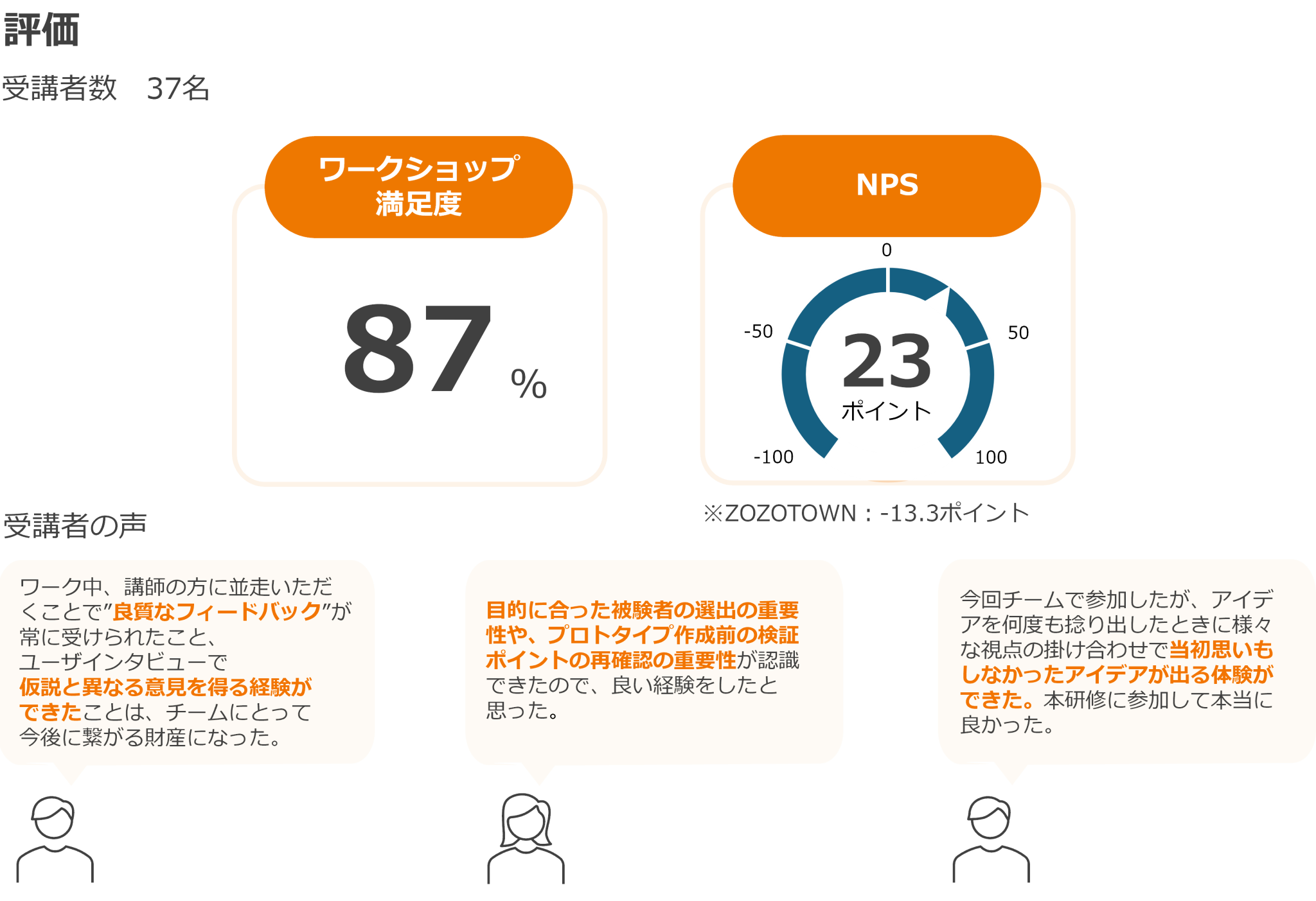 受講者からも「こんなにユーザの事を考えたのは初めてかも」、「いままで気づくことのできなかったインサイトを見つけることができた」という声をいただくが、当研修では、実際のプロジェクトで活かせるレベルのユーザに対する深堀り、即ち調査の実践をカリキュラムとして、取入れている。