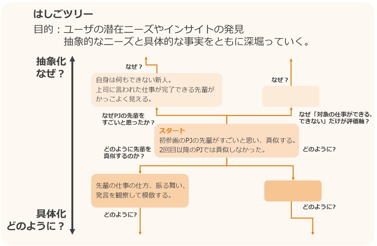 問題定義の最大の目的は、ユーザ自身が気づいていない潜在ニーズやインサイトを発見することにある。そのために、調査で得た情報から重要なポイントを選び、そのポイントを深掘り、他の情報と繋げ、その関係性を解釈することで意味を見出し、潜在ニーズやインサイトを見つけていく。当研修のワークでは、問題定義に半日以上時間を使う。はしごツリーというフレームワークを使い、抽象化(なぜ?)と具体化(どのように?)を繰り返し、チームメンバと意見を交えつつ、深掘りを行っていく。