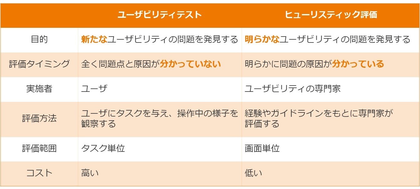 ユーザビリティの問題を発見するテストとして、この他にヒューリスティック評価というものがある。ヒューリスティック評価は専門家がユーザビリティの一般的な原則やベストプラクティスに基づいて、設計やインターフェースを評価するものとなっている。ヒューリスティック評価で、明らかな問題を洗い出し改善した後、ユーザビリティテストをすることを推奨する。ユーザビリティテストとヒューリスティック評価の違いは、以下の通りである。