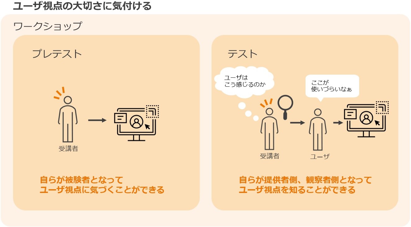 当研修の2つ目の特長は、「ユーザ視点の大切さに気付ける」という点である。設計したタスクで正しくテストできるかを検証するため、受講者の中から被験者を募りプレテストを実施する。プレテストを実施することにより、自分たちが設計したタスクの中でユーザが躓きそうなところや、わかりにくい部分を発見できる。プレテスト実施後には、ユーザが実施できるよう、タスクの改善を行うが、その中でユーザ視点の大切さをあらためて実感できるようになっている。