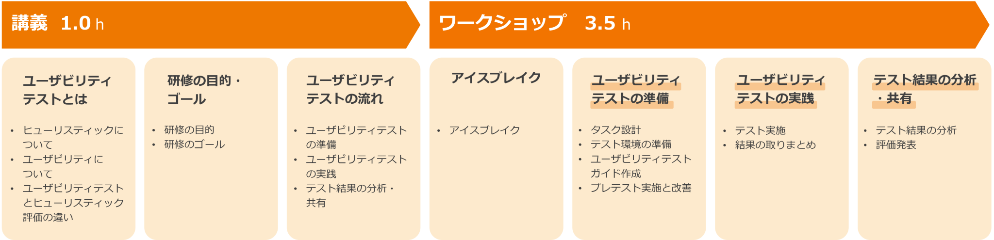 本研修のカリキュラムは、講義1時間、ワークショップ3.5時間となっており、実践を通じ理解を深め、受講者たちは、ユーザビリティの問題の発見速度や質を高めることができるようになる研修となっている。