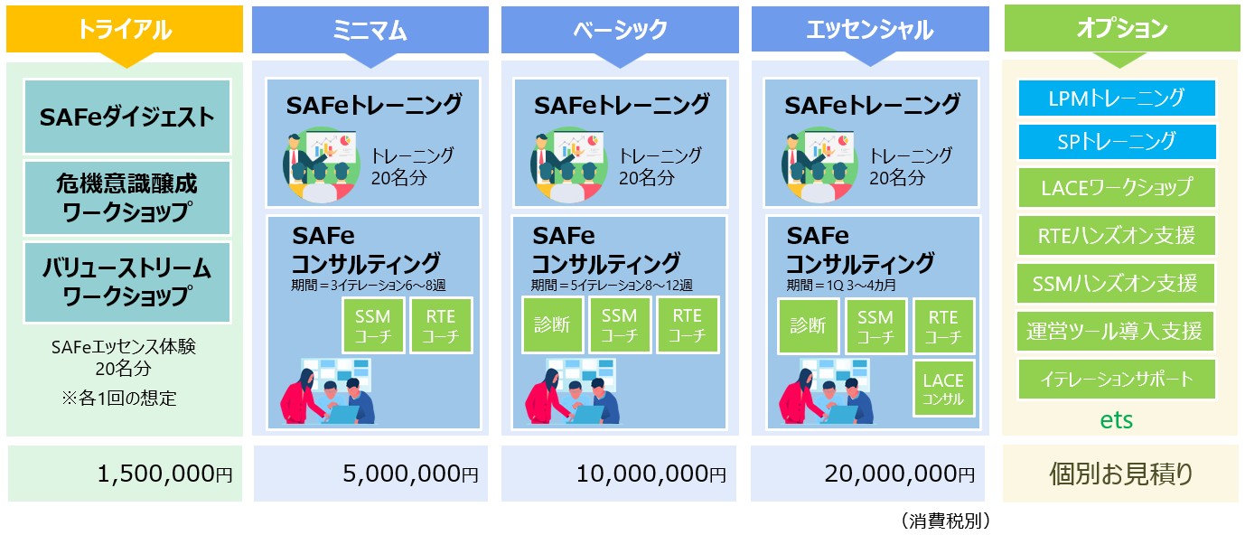 当社は、「本格導入前に概要を理解したい」「ちょっと試してみたい」というご要望やトレーニングを受講しただけでは組織が自律的に実践できるようになるまでに時間がかかるといった課題を受けて、独自のSAFe導入パッケージをご用意しました。当社のパッケージでは、トレーニングとコンサルティングを組み合わせ、小さな成功体験から徐々に拡大していくアプローチで、確実な導入と定着を支援します。