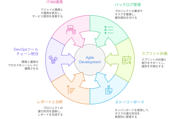 ServiceNowのAgile Developmentアプリケーションは、プロジェクト管理を効率化し、アジャイル開発のプロセスをサポートします。これには以下の機能が含まれます。