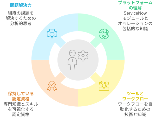 ServiceNowの導入で成果を出すためには、要件定義や仕様確認が必要なため、柔軟なコミュニケーション力が求められます。組織課題と現場課題を的確に把握し、解決するための問題の解決力も重要です。