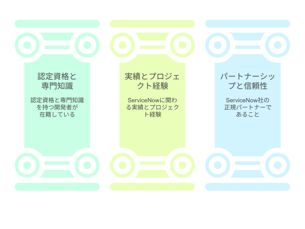 ServiceNowの開発会社には、開発者がいるだけでなく、クライアントのニーズに応えるための能力や体制が求められます。必要と考えられる能力や体制をご紹介します。
