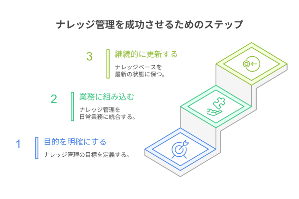 ナレッジ管理を成功させるには、単にツールを導入するだけでなく、運用面での工夫が重要です。目的やゴールを明確にし、現場で使われる仕組みとして定着させることで、継続的な効果を得ることができます。