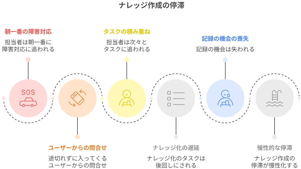 本来であれば、検索すれば解決策に到達でき、対応品質の均一化や MTTR 短縮が進むはずです。しかし現実は、作られず・更新されず・使われないまま静止し、“存在だけしている仕組み”に変わってしまっています。