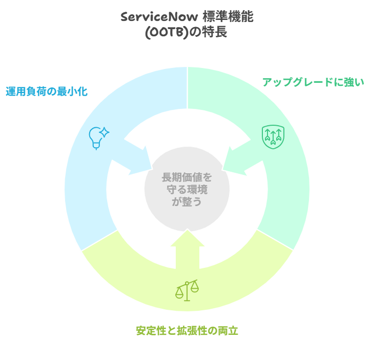 標準機能(OOTB)を中心に設計すれば、アップグレードの負担を大幅に軽減できます。これはIT投資効率を高め、運用負荷を抑えるための重要なポイントです。