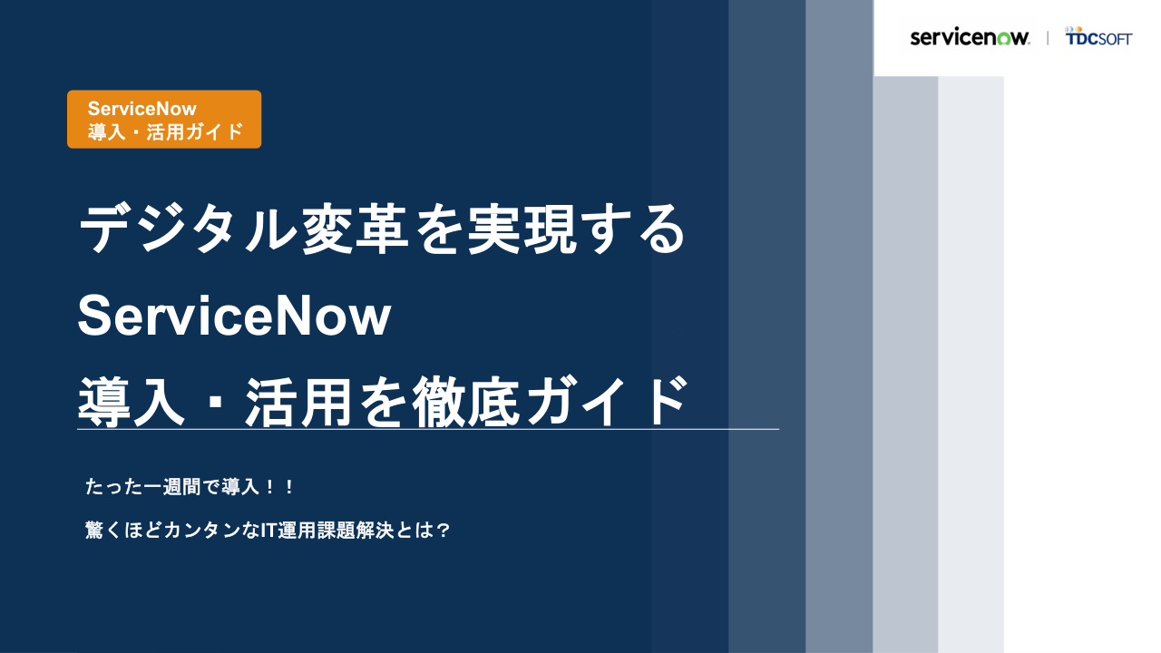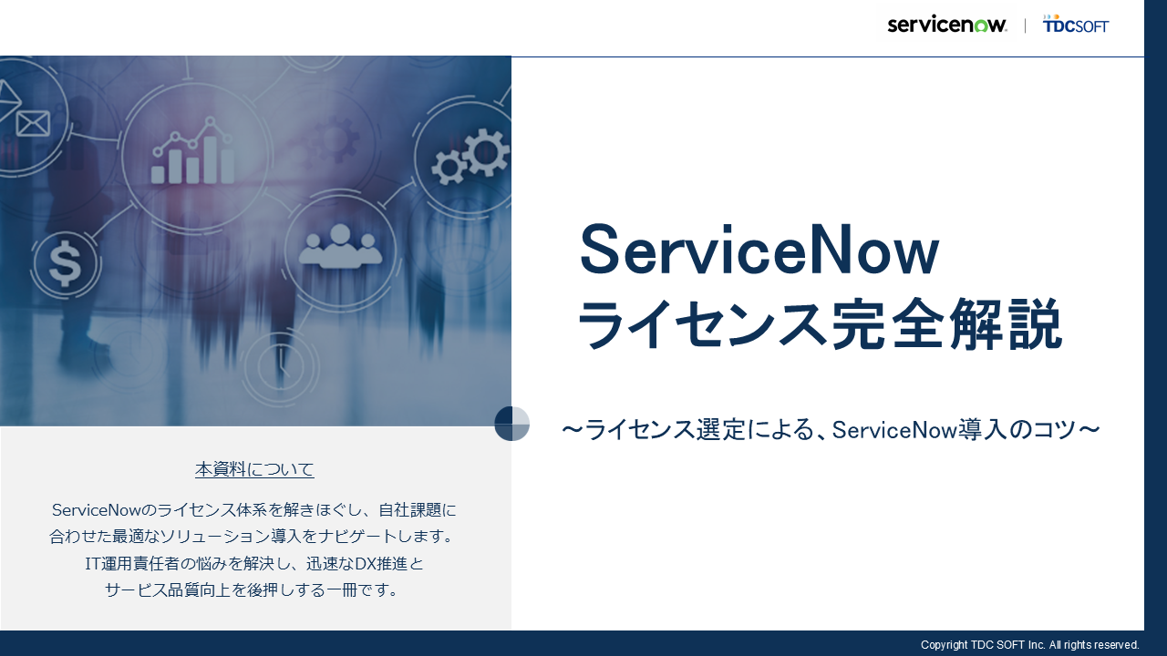 ServiceNowの概要や特長、TDCソフトの強み、部門別活用方法や導入の流れなどを掲載しています。貴社のビジネスがどう変化するのか?まずはこちらの資料でお確かめください。