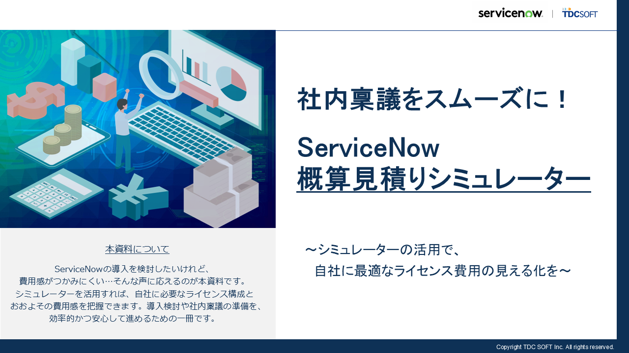 Servicenowの導入を検討したいけれど、費用感がつかみにくい…そんな声に応えるのが本資料です。シミュレーターを活用すれば、自社に必要なライセンス構成とおおよその費用感を把握できます。導入検討や社内稟議の準備を、効率的かつ安心して進めるための一冊です。