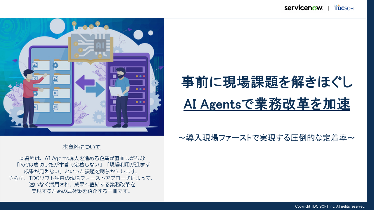 本資料は、AI Agents導入を進める企業が直面しがちな「PoCは成功したが本番で定着しない」「現場利用が進まず成果が見えない」といった課題を明らかにします。さらに、TDCソフト独自の現場ファーストアプローチによって、迷いなく活用され、成果へ直結する業務改革を実現するための具体策を紹介する一冊です。